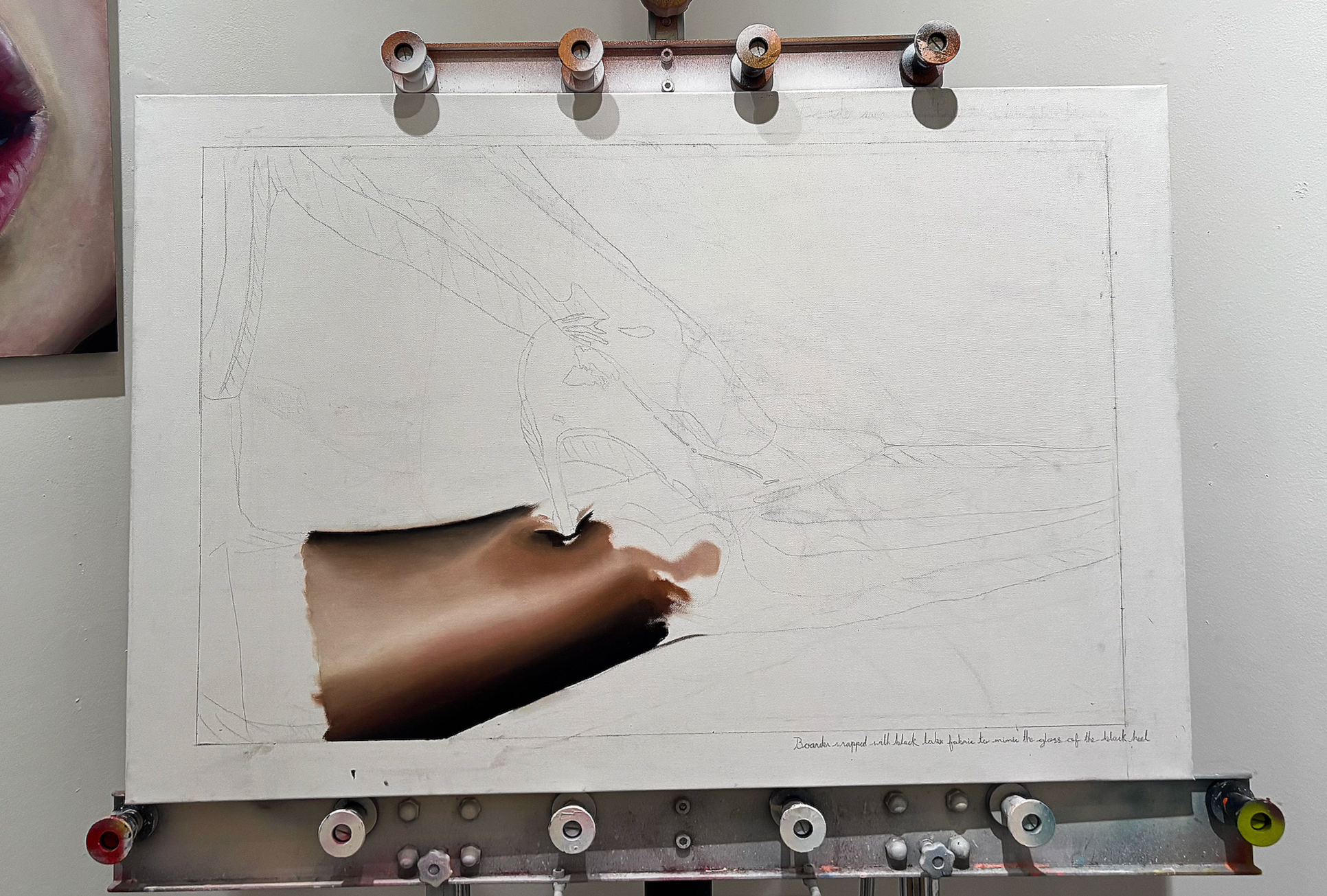 This oil paint-focused mixed-media artwork is part of the series It’s Not For You, which explores themes of the female form as well as the "expectations and power" that come from it. Specifically, attributes, conformities, and accessories that make women feel powerful and confident, but from the male gaze, are seen as sexualized and worn/ acted upon for their pleasure.