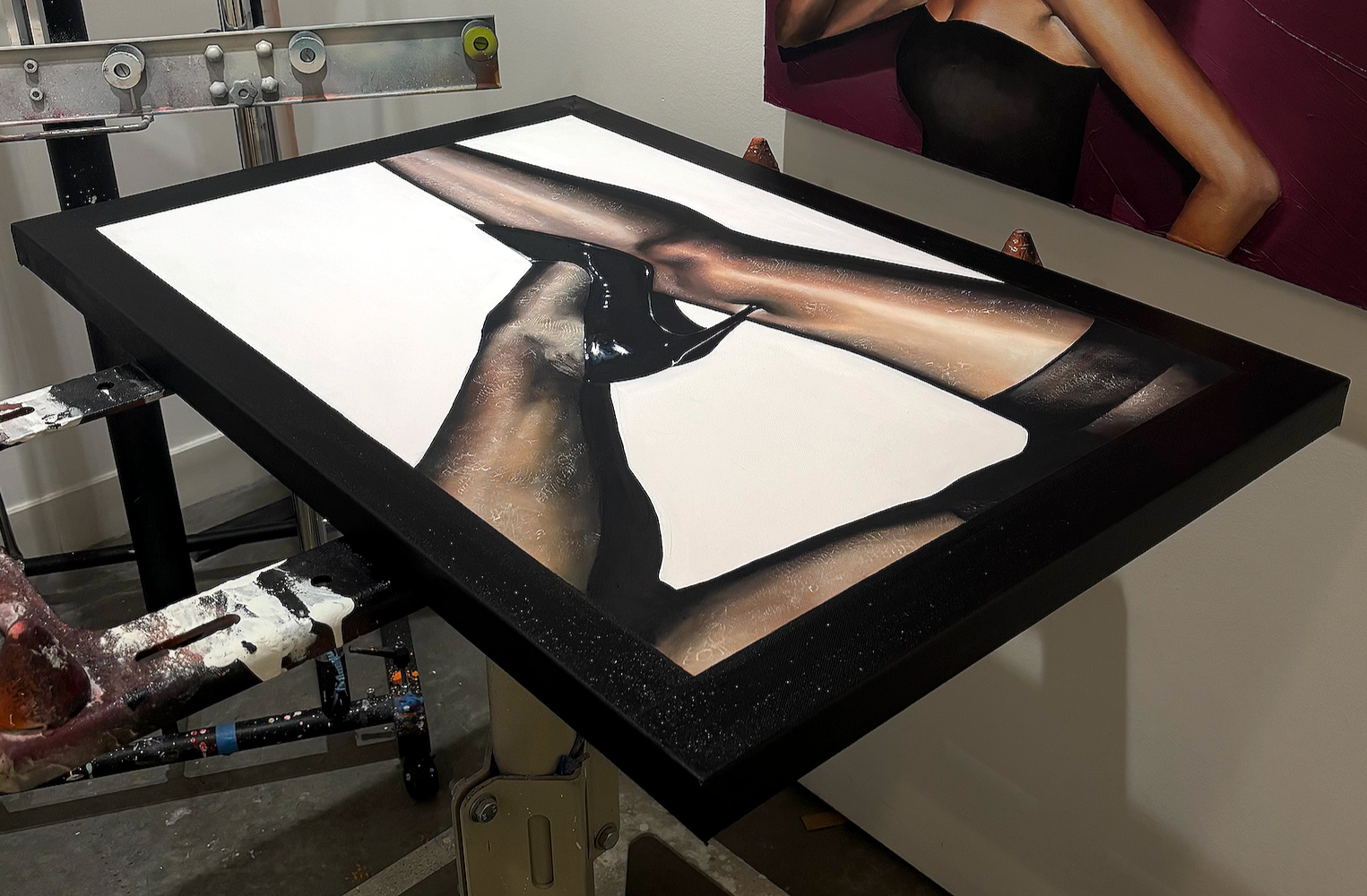 My first step was to sketch out the composition for this artwork, which is from my photography. I then left room for a border, which at the final step will be wrapped in a glossy black fabric to mimic the heels' shiny effect.